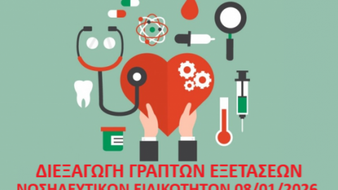 Ανακοίνωση – Διεξαγωγή Γραπτών Εξετάσεων Περιόδου Ιανουαρίου 2026, Υποψηφίων Ειδικευομένων Νοσηλευτών, για την Απόκτηση του Τίτλου των Νοσηλευτικών Ειδικοτήτων της «Επείγουσας και Εντατικής Νοσηλευτικής», της «Νοσηλευτικής Δημόσιας Υγείας/Κοινοτικής Νοσηλευτικής», της «Νοσηλευτικής Ψυχικής Υγείας», της «Νοσηλευτικής Καρδιαγγειακών Παθήσεων», της «Ογκολογικής Νοσηλευτικής»,…