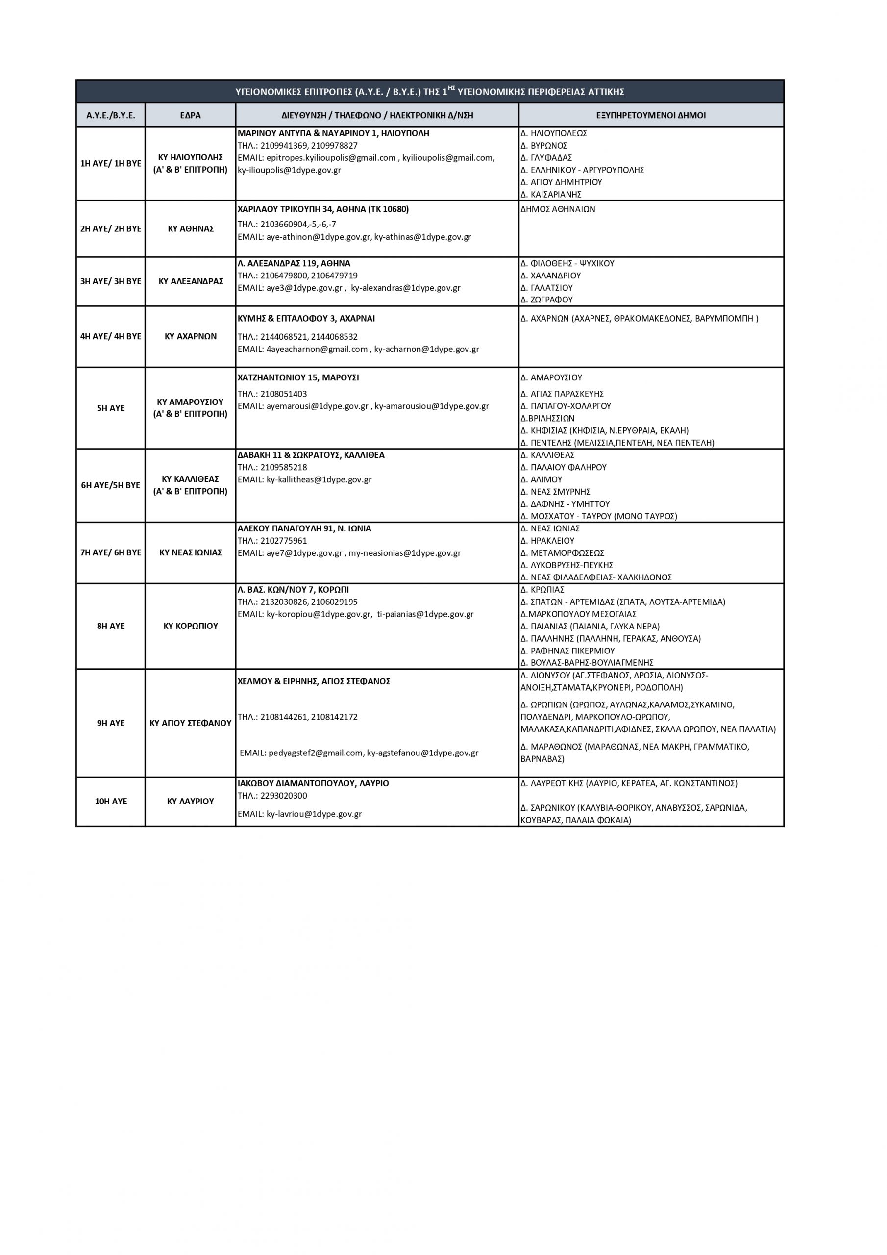 Με την υπ’ αριθμ. Α1β/Γ.Π. 50556/ 28-9-2022 (ΑΔΑ: ΨΣΟΓ465ΦΥΟ-ΝΣ5) Απόφαση Αναπληρώτριας Υπουργού Υγείας συγκροτήθηκαν και ορίστηκαν τα μέλη στις Πρωτοβάθμιες & Δευτεροβάθμιες Υγειονομικές Επιτροπές (ΑΥΕ και ΒΥΕ) της 1ης Υγειονομικής Περιφέρειας Αττικής. Η εν λόγω απόφαση τροποποιήθηκε με την υπ’ αριθμ. Α1β/Γ.Π. 58209/9-12-2022 (ΑΔΑ: 6ΒΡ3465ΦΥΟ-ΧΘΥ) 1η Τροποποίηση Απόφασης , με θέμα: «Συγκρότηση και ορισμός μελών στις Πρωτοβάθμιες και Δευτεροβάθμιες Υγειονομικές Επιτροπές (Α.Υ.Ε. και Β.Υ.Ε) της 1ης Υγειονομικής Περιφέρειας Αττικής». Οι ανωτέρω Υγειονομικές Επιτροπές είναι αρμόδιες να αποφαίνονται για θέματα υγείας υπαλλήλων, να γνωματεύουν δηλαδή επί αναρρωτικών αδειών Νομικών Προσώπων Δημοσίου Δικαίου Δημοσίου, οι οποίοι διατήρησαν την υγειονομική ασφάλιση του Ι.Κ.Α., υπαλλήλων με σχέση εργασίας Ιδιωτικού Δικαίου Αορίστου Χρόνου, αλλά και επί αναρρωτικών αδειών των εργαζομένων στον ιδιωτικό τομέα. Οι Δ/νσεις Προσωπικού και οι εργαζόμενοι μπορούν να απευθύνονται στην Υγειονομική Επιτροπή ανάλογα με την έδρα (Δήμο) του ασθενούς, σύμφωνα με τον κάτωθι Πίνακα: