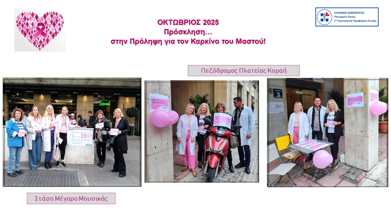 Στο πλαίσιο της Πανελλαδικής Εκστρατείας από τους Αρμόδιους Φορείς Υγείας για την Επικοινωνία του Εθνικού Προγράμματος Πρόληψης για τον Καρκίνο του Μαστού «ΦΩΦΗ ΓΕΝΝΗΜΑΤΑ» στον πληθυσμό στόχο, η Διεύθυνση Δημόσιας Υγείας της 1η ΥΠΕ Αττικής σε συνεργασία με το Δίκτυο Μαιών, θα διεξάγει Ενημερωτικές Δράσεις από 20-24/10/2025: