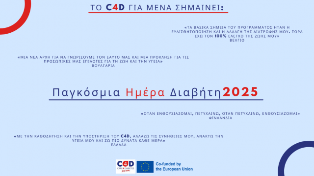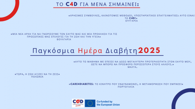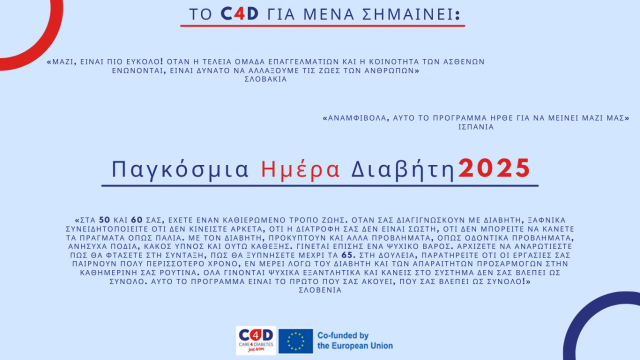 - Για τον φετινό εορτασμό της Παγκόσμιας Ημέρας Διαβήτη, η Ελληνική ομάδα του C4D δημιούργησε τα ακόλουθα πρότυπα με τις εμπειρίες των ασθενών από όλες τις χώρες που συμμετέχουν στο πρόγραμμα και μοιράζονται μαζί σας την θετική εμπειρία τους στο πρόγραμμα.