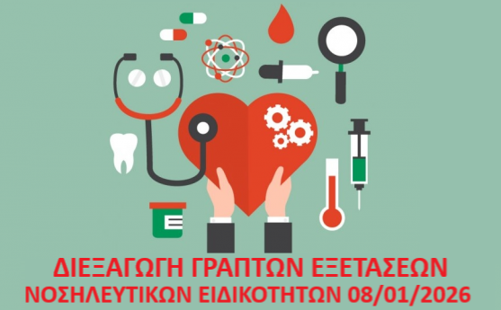 Ως ημερομηνία διενέργειας των γραπτών εξετάσεων για την απόκτηση του τίτλου των νοσηλευτικών ειδικοτήτων ορίζεται η 8η Ιανουαρίου 2026, ημέρα Πέμπτη και ώρα 10:00 έως 13:00. Ο χρόνος εξέτασης είναι μία (1) ώρα.